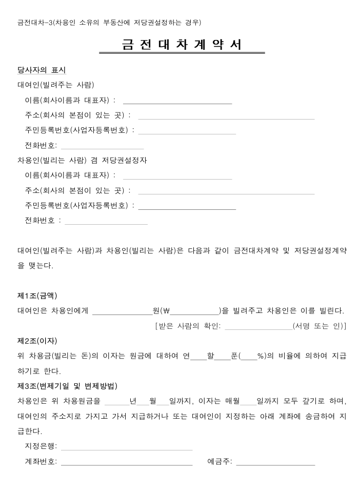 | 금전대차계약서(제3자 소유의 부동산에 저당권 설정하는 경우) (0) | 2025.09.18 |