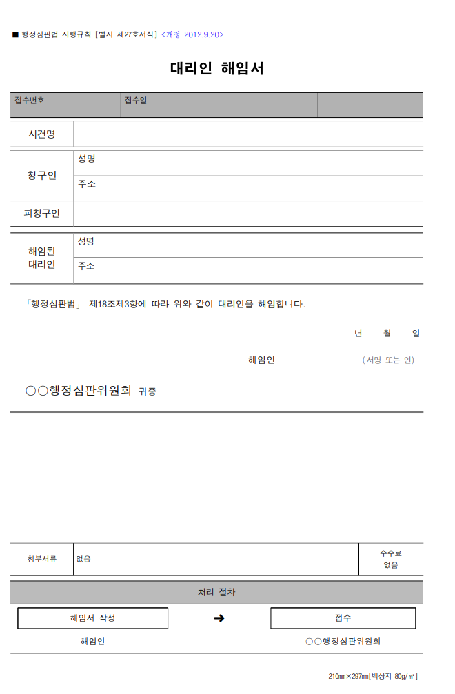 이 글은 「행정심판법 시행규칙」 [별지 제27호서식] 대리인 해임서 안내입니다.