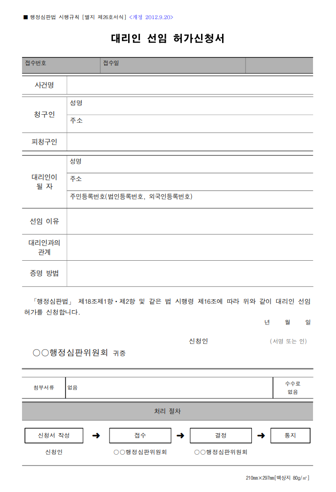 이 글은 「행정심판법 시행규칙」 [별지 제26호서식] 대리인 선임 허가신청서 안내입니다.