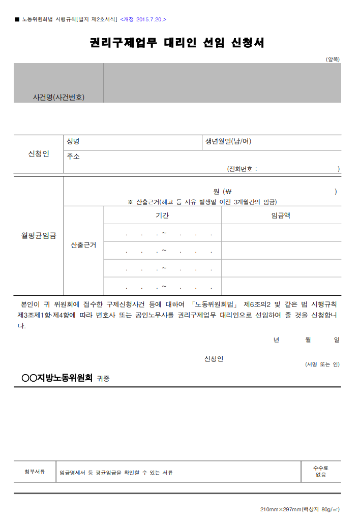 이 글은 「노동위원회법 시행규칙」 [별지 제2호서식] 권리구제업무 대리인 선임 신청서 안내입니다.