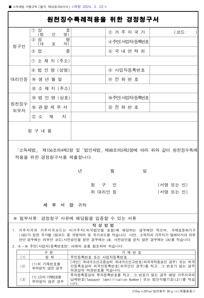 ‘원천징수특례적용을 위한 경정청구서’ <개정 2024. 3. 22.>서식 내 ISO코드, 라부안코드, 주민(사업자)등록번호 작성기준 및 첨부서류 명시