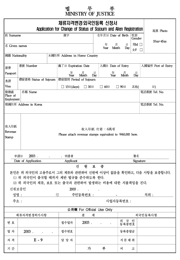 - 서식명: 체류자격변경·외국인등록 신청서