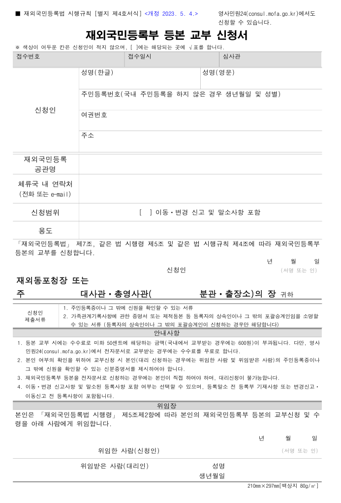 이 글은 「재외국민등록법 시행규칙」 **별지 제4호서식 (개정 2023. 5. 4.)**에 따른 재외국민등록부 등본 교부 신청서 안내입니다.