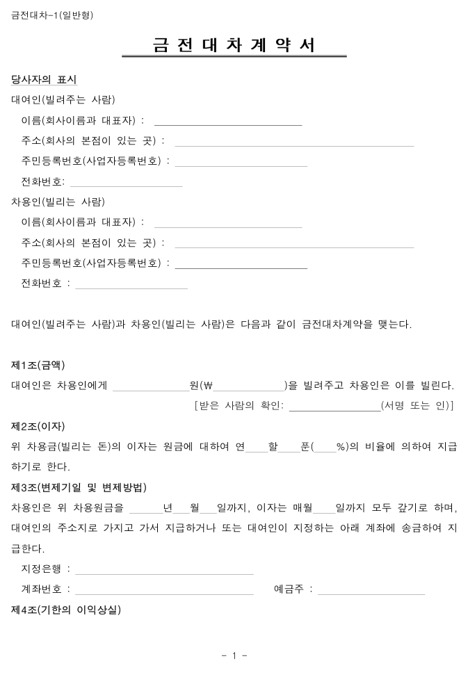 이 글은 일반적인 금전대차계약서(일반형) 작성 예시를 안내합니다.