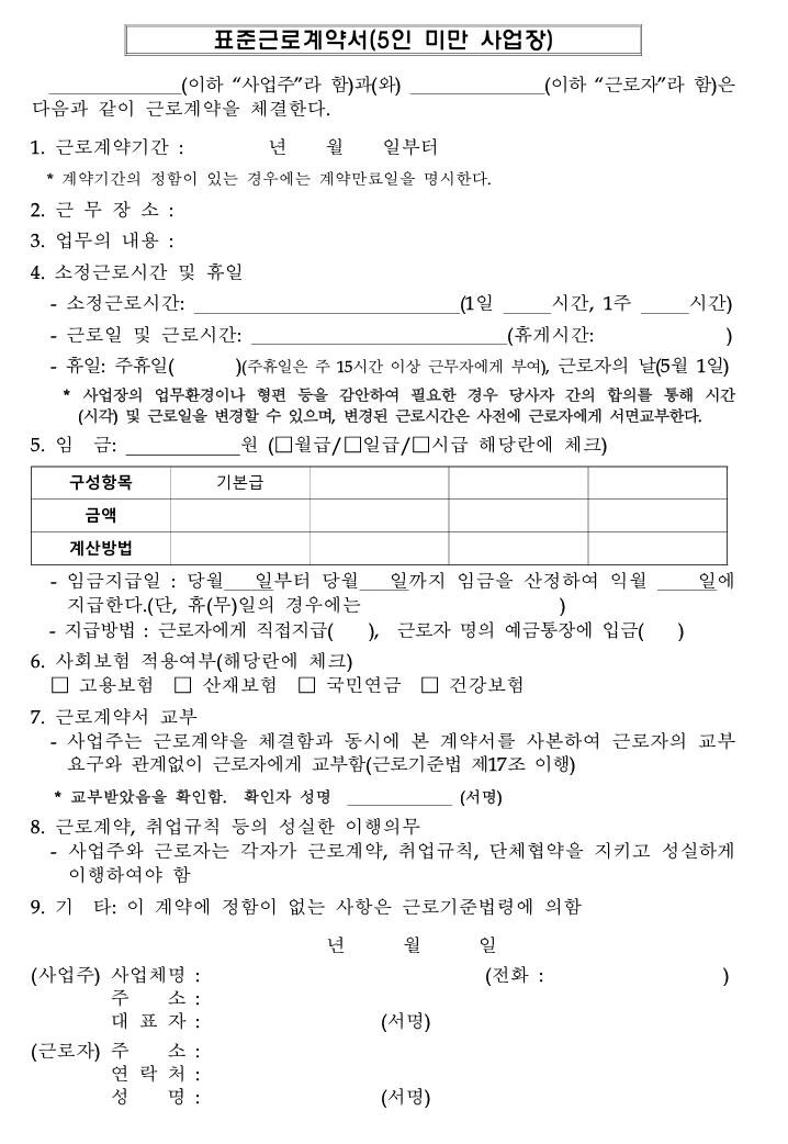 - 표준근로계약서(5인 미만 사업장).hwp → [바로받기](sandbox:/mnt/data/표준근로계약서(5인 미만 사업장).hwp)
